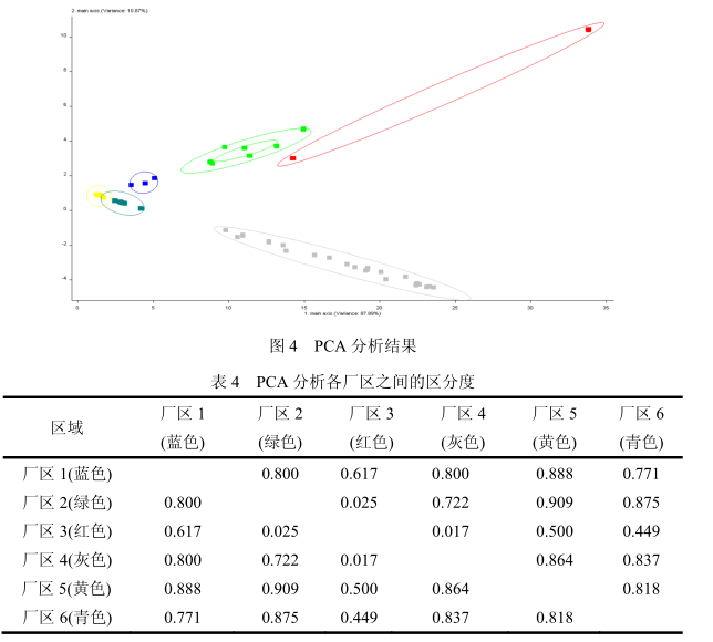 实验结果:(1) 本文基于典型恶臭污染源样品的电子鼻分析和人工嗅辨结果, 建立了电子鼻臭气浓度反演曲线,并按照厂区分类, 使用电子鼻采集了 6 个厂区排放特征恶臭污染物的响应雷达图, 结合主成分分析和聚类分析, 初步建立了该工业区主要恶臭排放企业的特征指纹库。
